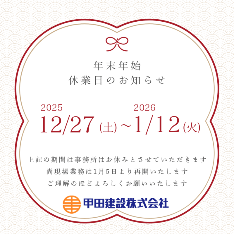 12月から甲田建設は40期に入りました。 工事のご相談や現場でのやり取りなど、たくさんのご縁をいただき、本当にありがとうございます。 ここまで来られたのも、お客様や協力会社の皆さま、地域の方々のおかげです。本当にありがと […]
